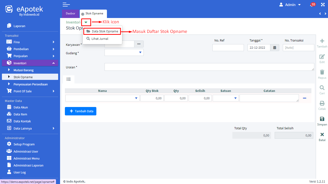 - Masuk ke menu Inventori lalu pilih [Stok Opname]