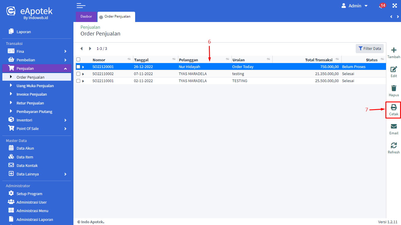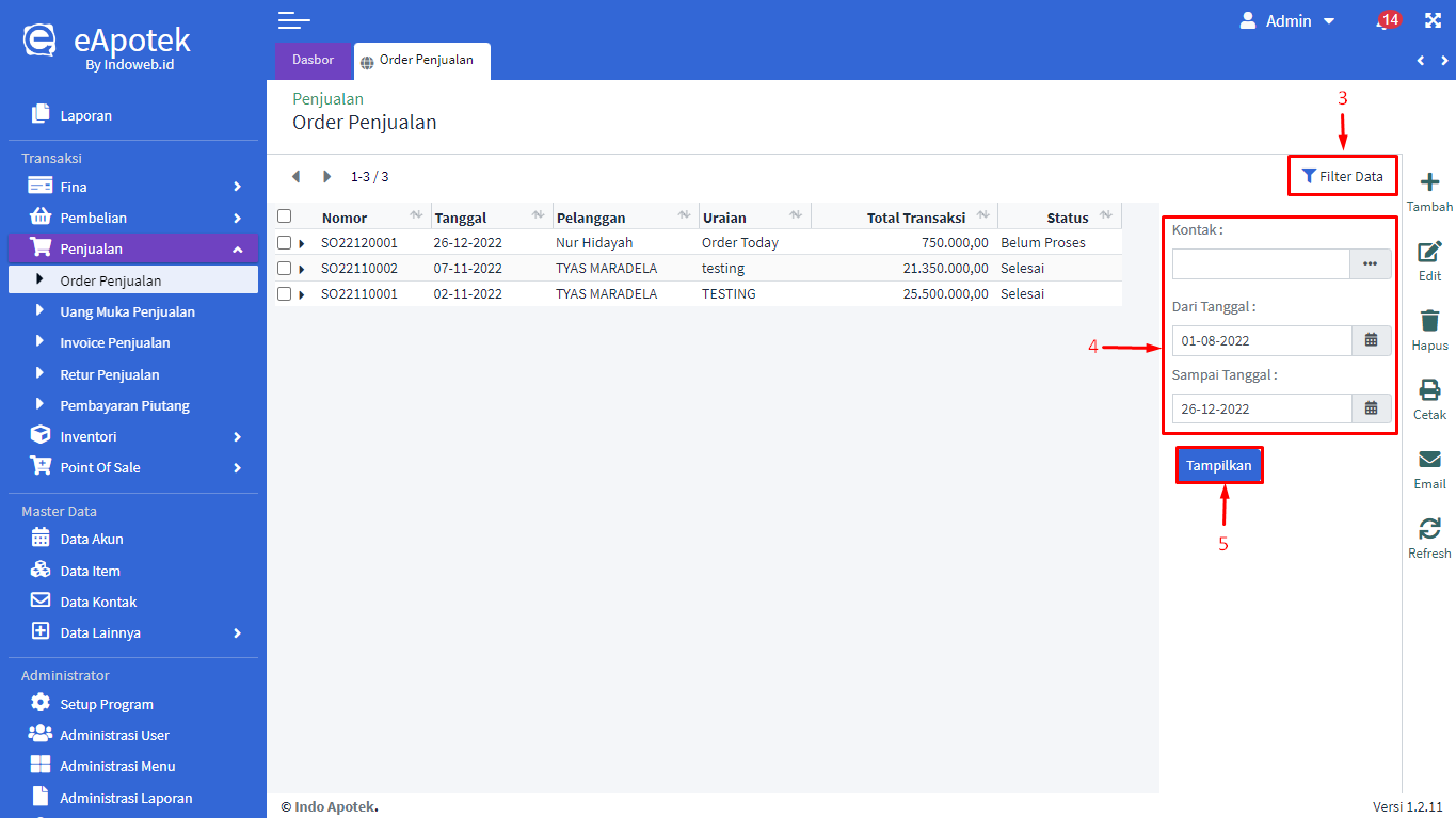- Tampil Daftar Order Penjualan yang sudah berhasil. Anda juga bisa menggunakan filter orderan dengan cara klik [Filter Data]