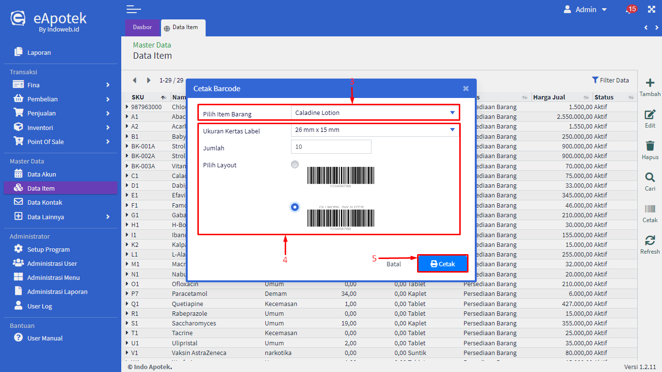 - Akan muncul pop-up Cetak Barcode, kemudian Pilih Item Barang (Contoh : Caladine Lotion)