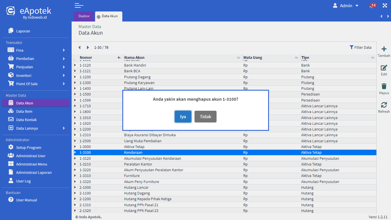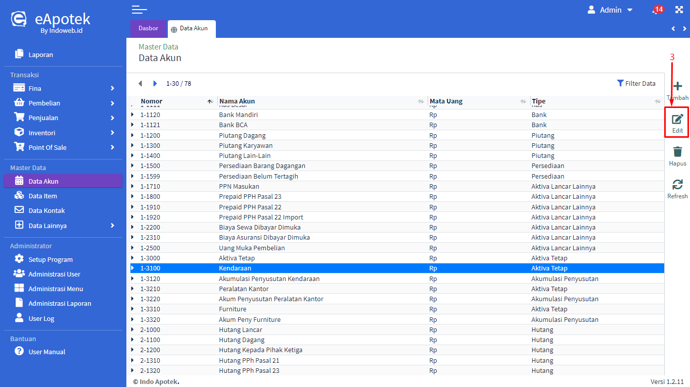 - Kemudian pada halaman Data Akun, untuk mengedit Data Akun klik pada baris data akun yang akan diedit