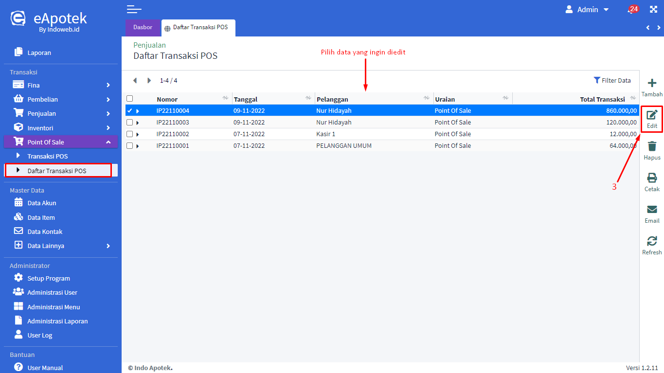 - Tampil halaman Daftar Transaksi POS kemudian klik atau pilih data transaksi yang ingin diedit