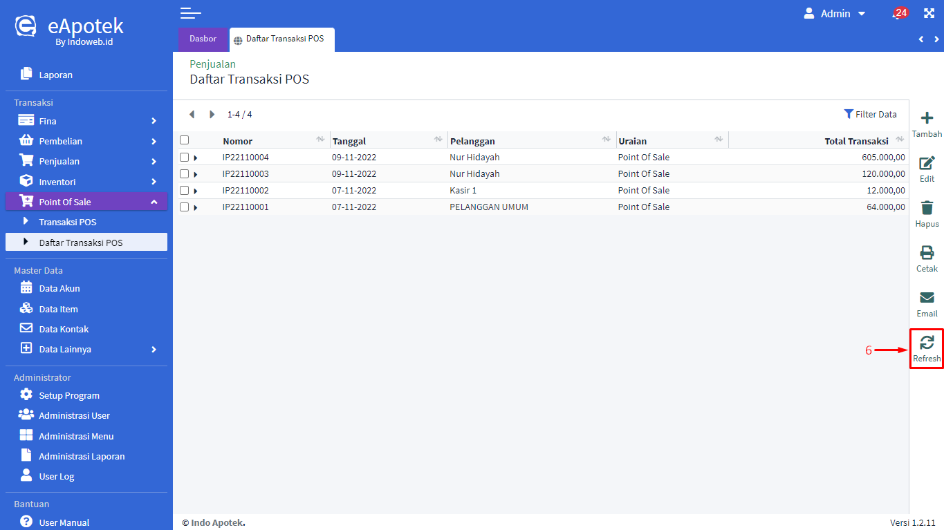 - Lalu kembali ke halaman Daftar Transaksi POS, klik [Refresh] untuk menyinkronkan