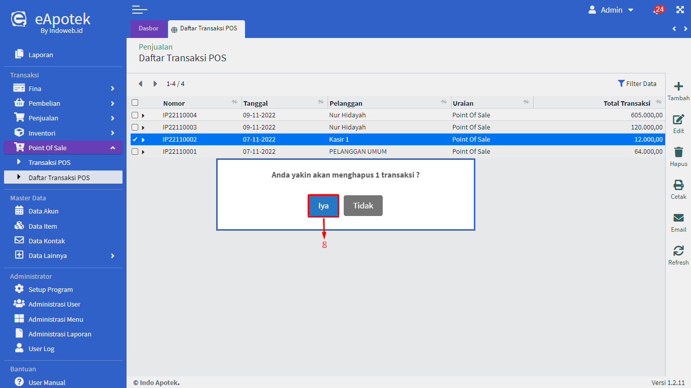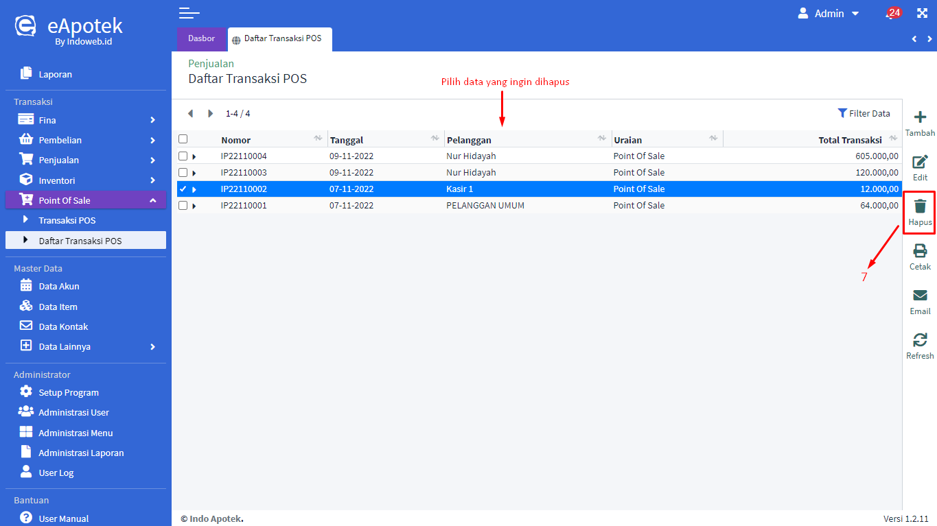 - Jika Anda ingin menghapus data transaksi, klik data yang ingin dihapus kemudian klik [Hapus]