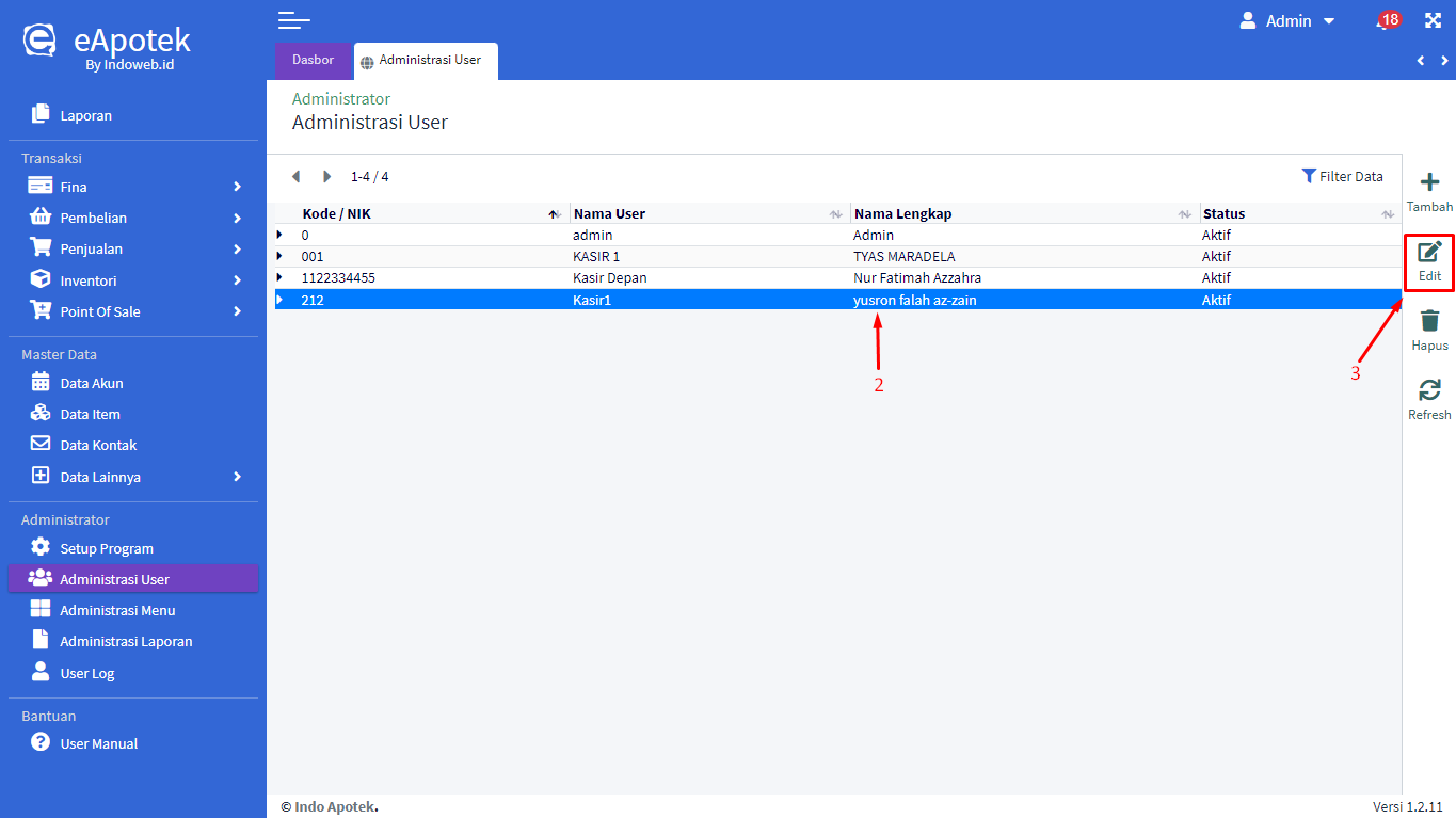 - Edit data User sudah berhasil. Anda juga bisa menghapus user dengan cara pilih/klik terlebih dahulu user yang ingin dihapus
