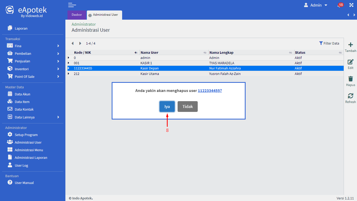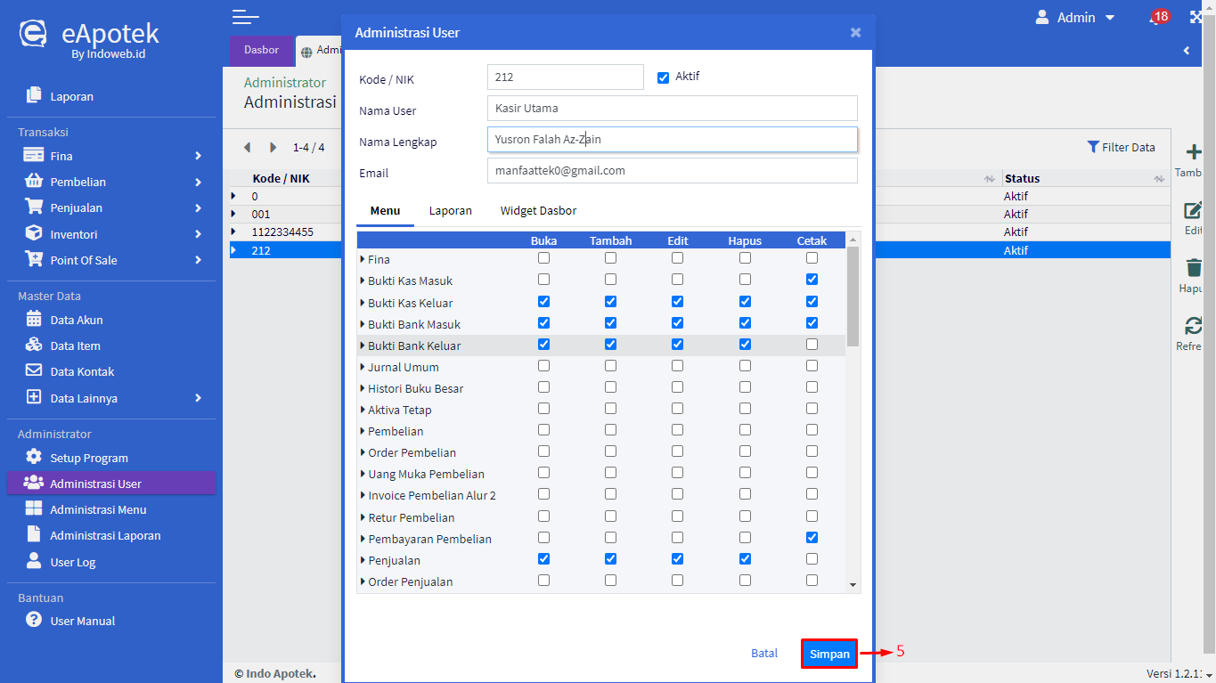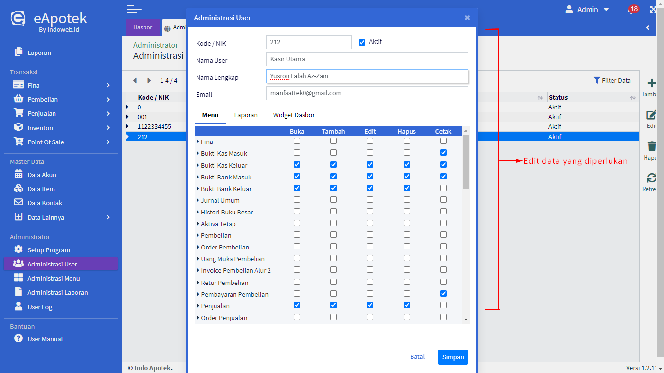 - Muncul pop-up form Administrasi User yang sudah diisi, kemudian edit data yang diperlukan misalnya Nama Lengkap atau Menu