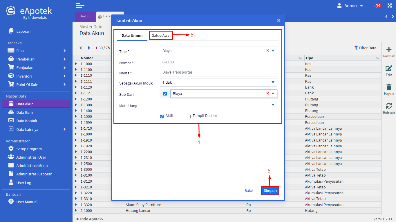 - Contoh (Tipe : Biaya, Nomor : 6-1100, Nama : Biaya Transportasi, Sub dari : Biaya)
