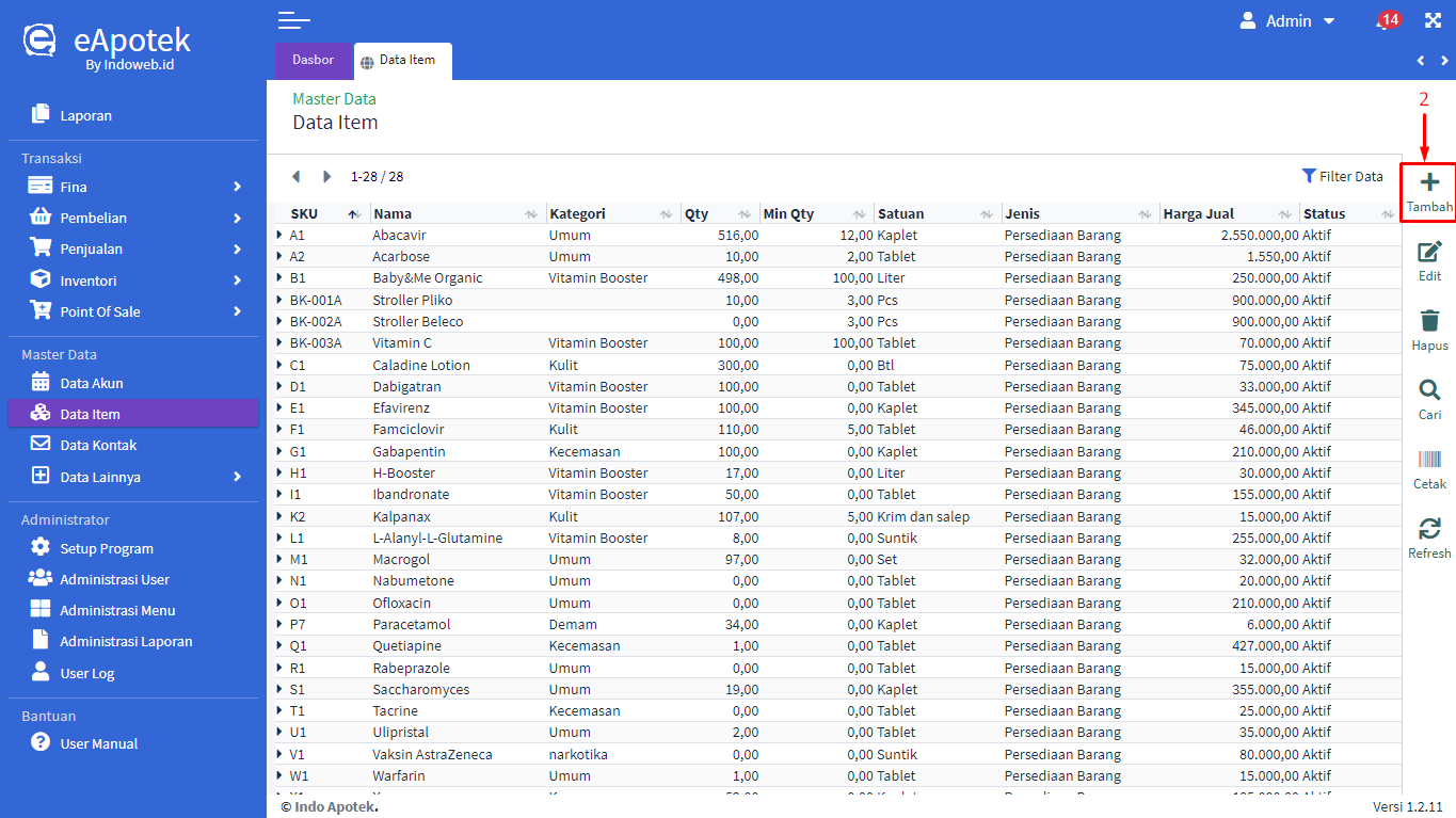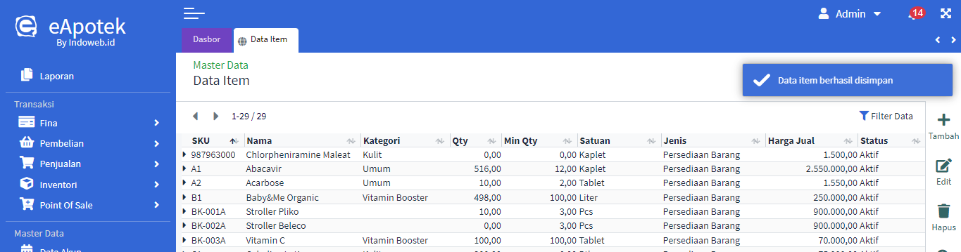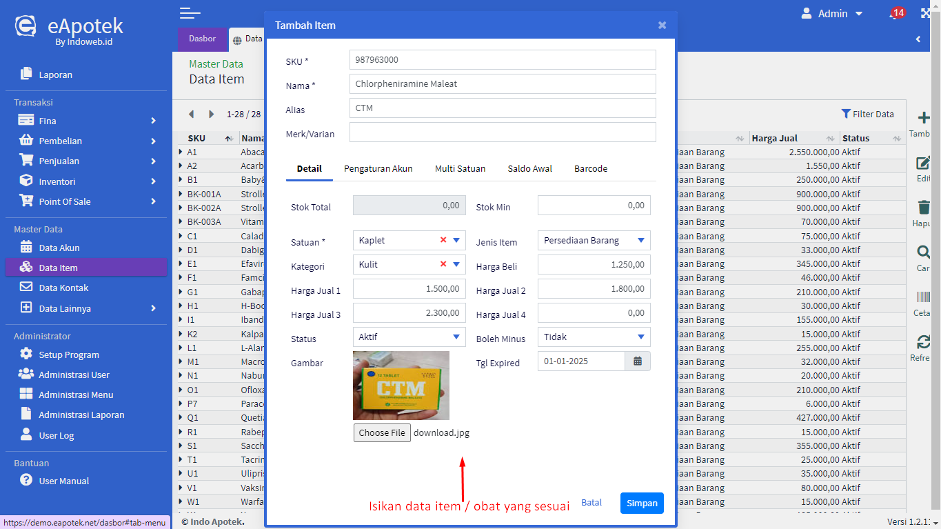 - Muncul pop-up form untuk mengisi Data Item, isikan data item obat mulai dari SKU sampai dengan Tanggal Expired (Cek contoh pengisian pada gambar)
