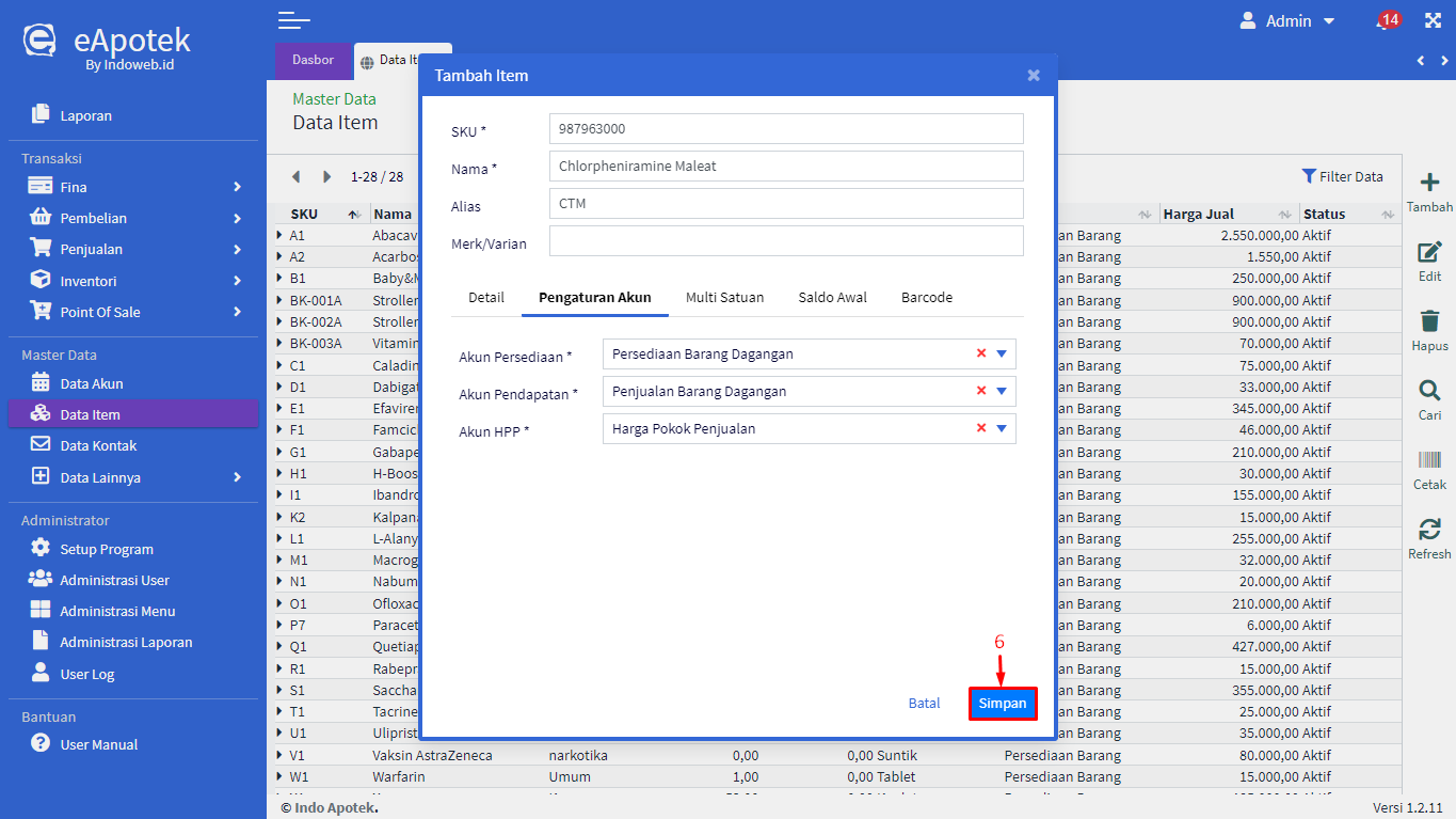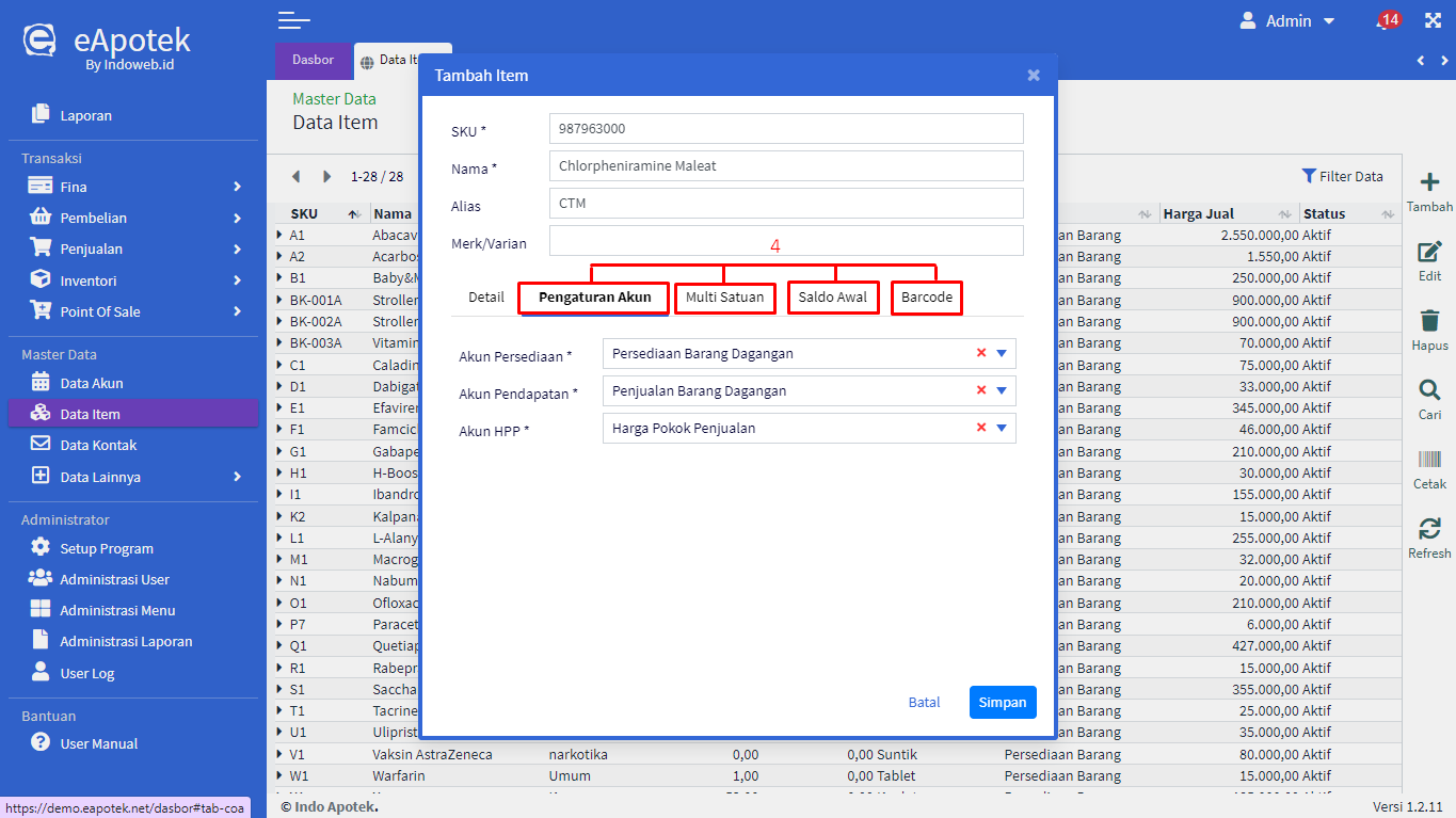 - Anda juga bisa mengisikan data pada tab lainnya (Pengaturan Akun, Multi Satuan, Saldo Awal, Barcode)