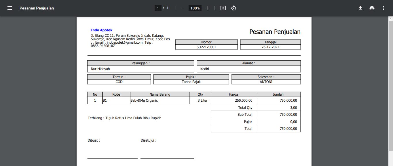 - Lalu tampil halaman preview Hasil Order Penjualan, Anda bisa langsung [Cetak] atau [Download] hasil tersebut