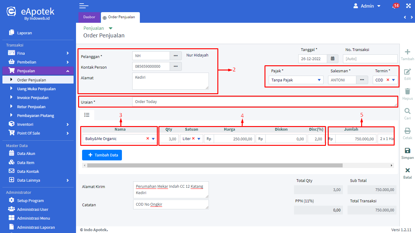 - Tampil halaman Order Penjualan kemudian isi form untuk order mulai dari Pelanggan, Kontak Person, Alamat (Otomatis), Uraian, Pajak, Salesman, dan Termin. Semua form wajib diisi, kecuali form No Transaksi karena akan otomatis
