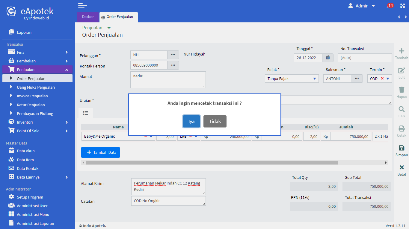- Muncul pop-up konfirmasi untuk mencetak transaksi, kemudian klik [Iya]