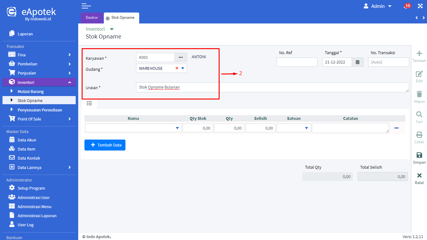 - Tampil halaman form Stok Opname, kemudian isikan data mulai dari Karyawan, Gudang, dan Uraian