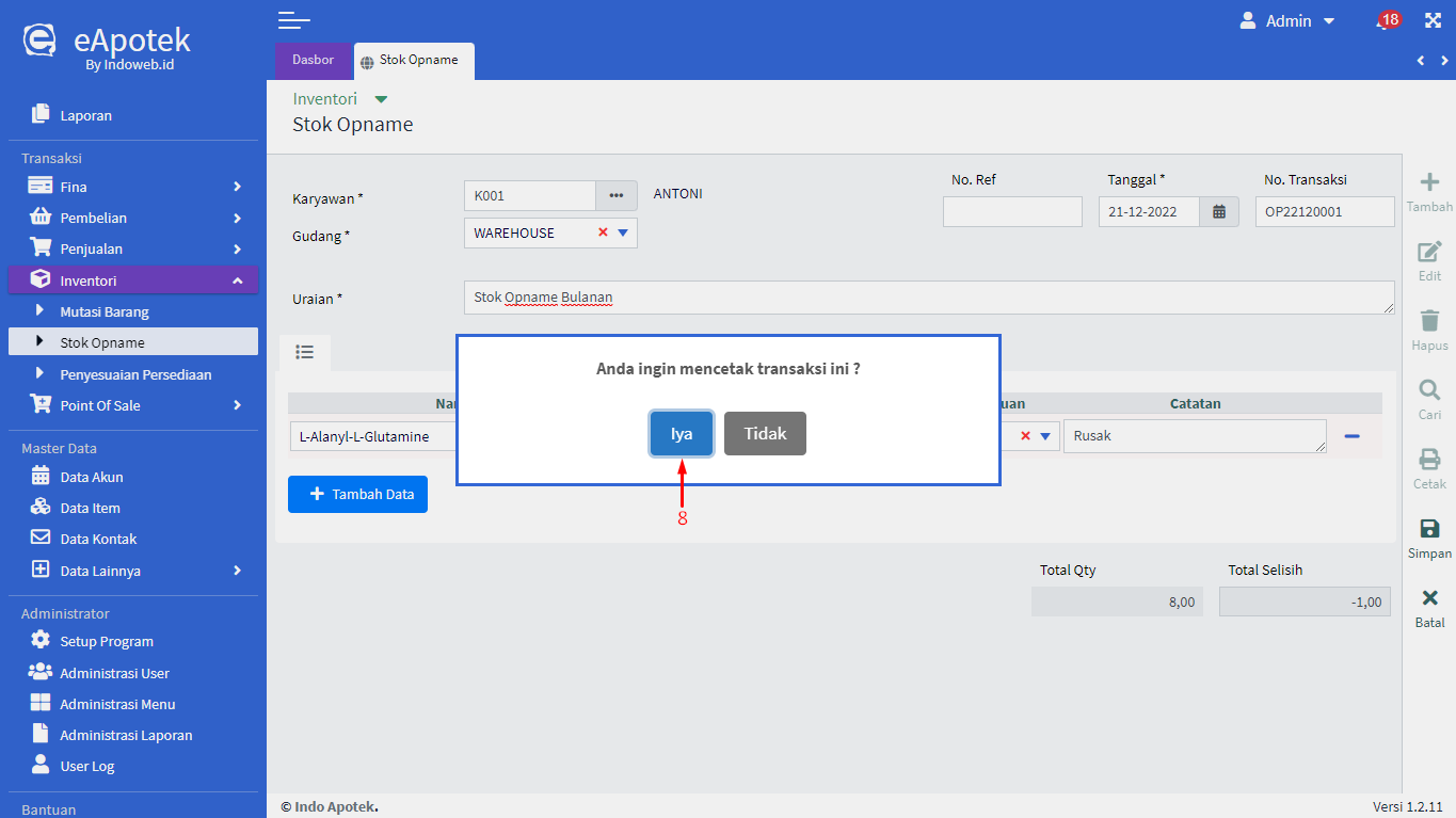 - Muncul pop-up konfirmasi untuk cetak transaksi, klik [Iya]
