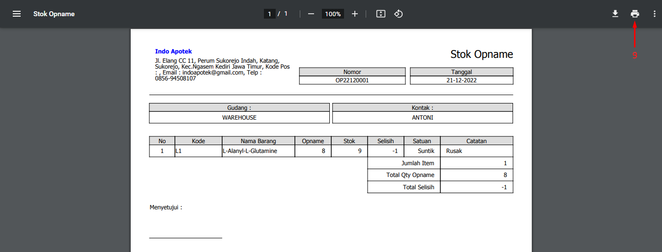 - Otomatis muncul preview lembar stok opname, Anda bisa mencetak dengan klik Print